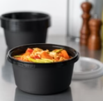 Karat PP Tamper Resistant Injection Molded, Black Food Container with a clear Lid are designed to keep your food fresh and secure. Made from durable plastic, these deli containers with lids are perfect for storing soup, sauces, and other food items. The containers come in various sizes including 34oz, 44oz, 52oz, and 60oz, making them versatile for all your storage needs. They are also microwaveable, offering you the convenience of reheating your food without transferring it to another dish.