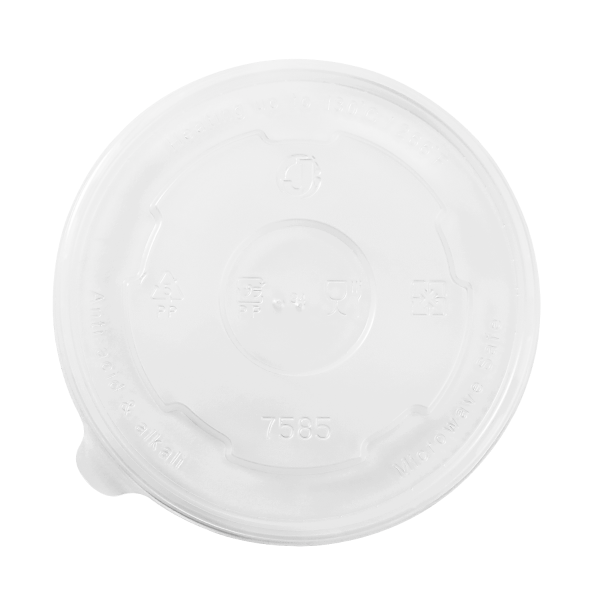 Karat high quality polypropylene (PP) flat lids are design to fit Karat double poly paper cold/hot food containers. Flat lids feature a venting hole for hot food items such as mashed potatoes and soups.