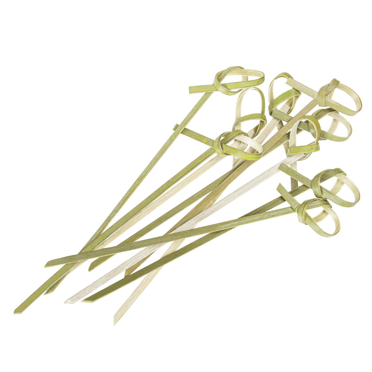 Prepare the perfect charcuterie board, appetizer platter, snack table, or even cocktail garnish with the Karat Earth 4" Bamboo Knot Skewer. These sturdy biodegradable mini skewers are food safe and have many applications. The knot design offers a stylish option when presenting your bite-size foods. For slightly larger bites, check out the 7" size.