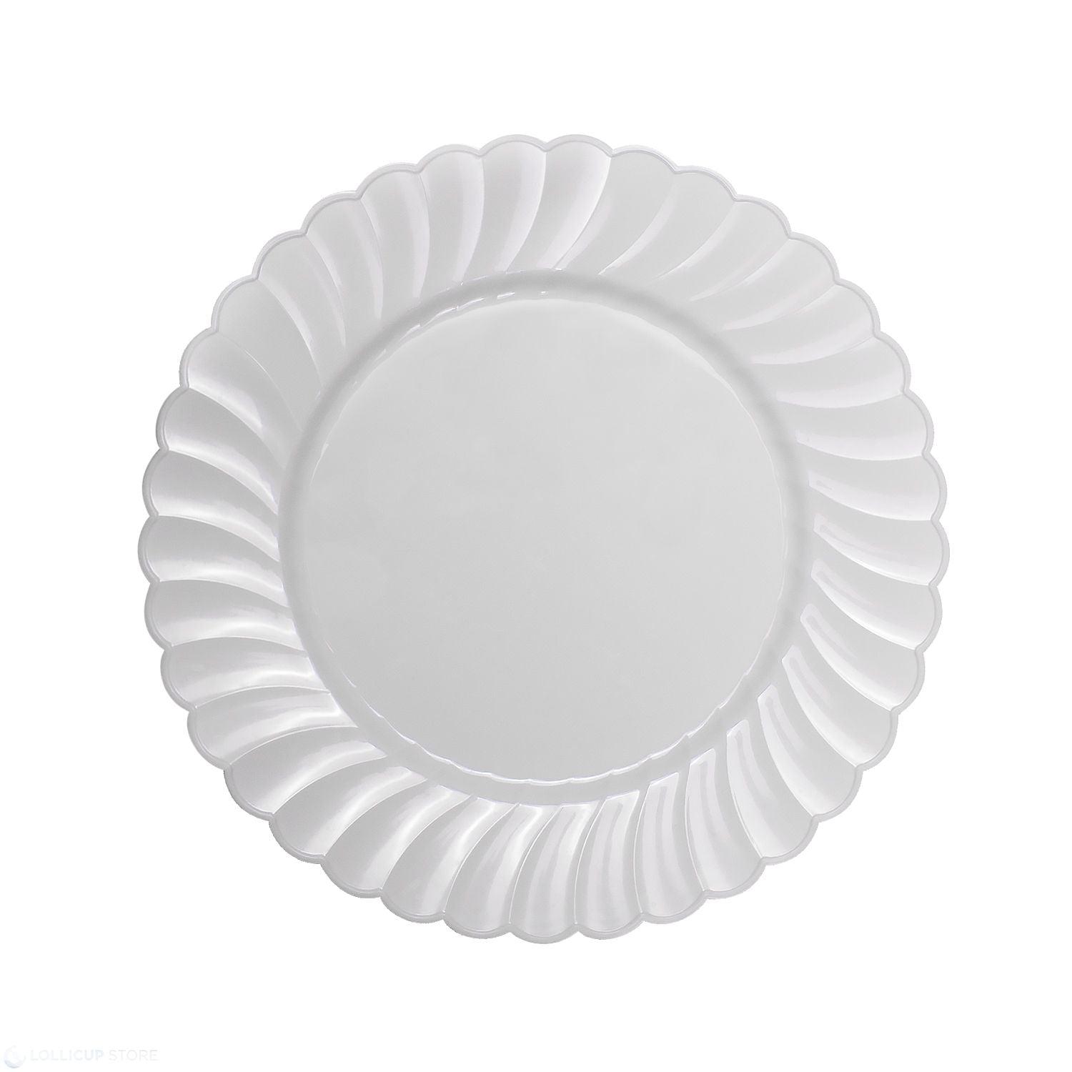Karat® scalloped PS plastic plates are a sturdy option for serving delicious appetizers, entrees and desserts. These plates are perfect for catering special events, including parties, banquets and much more.