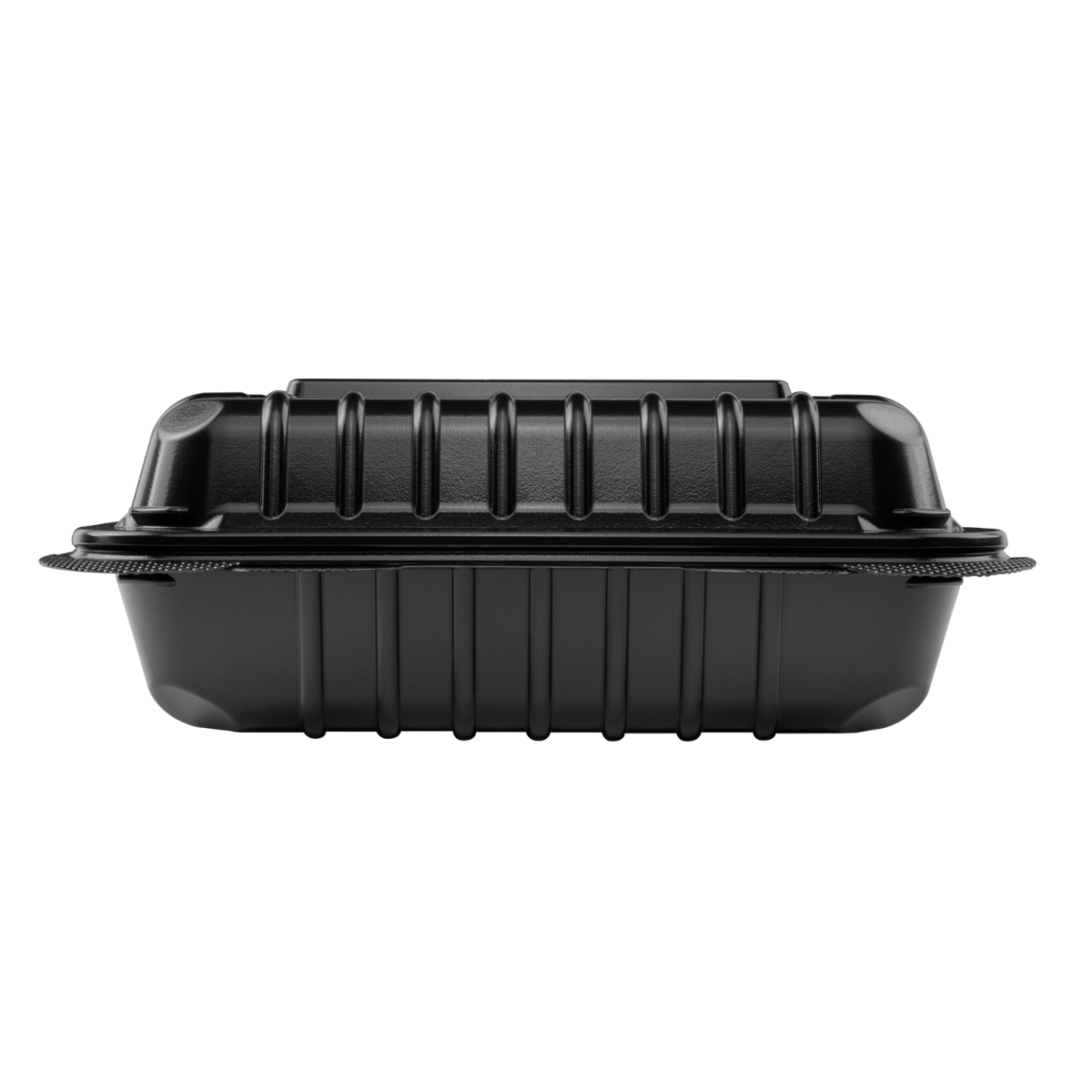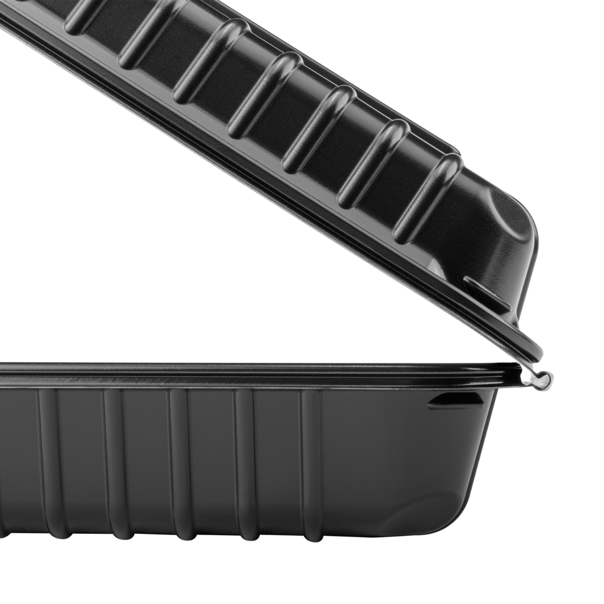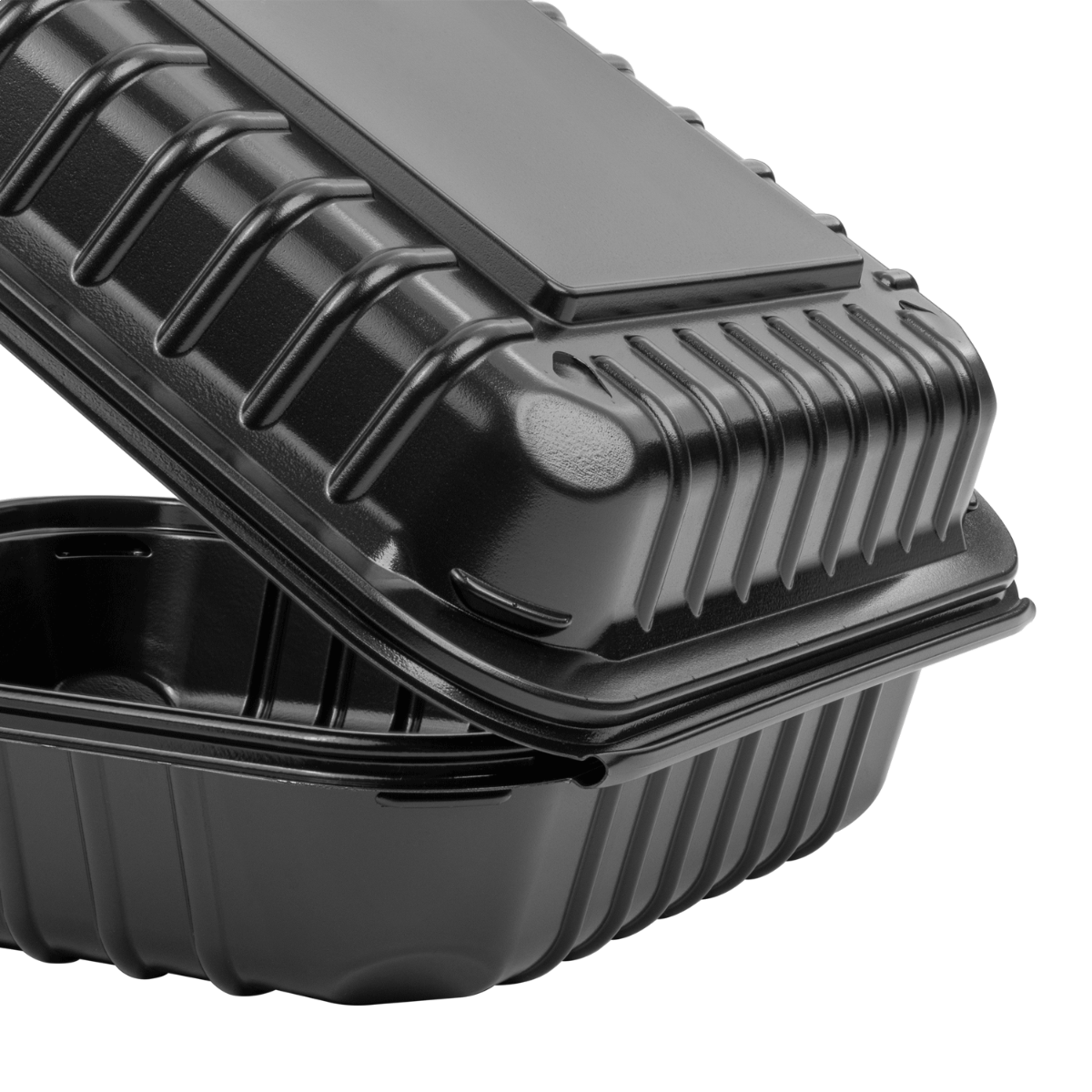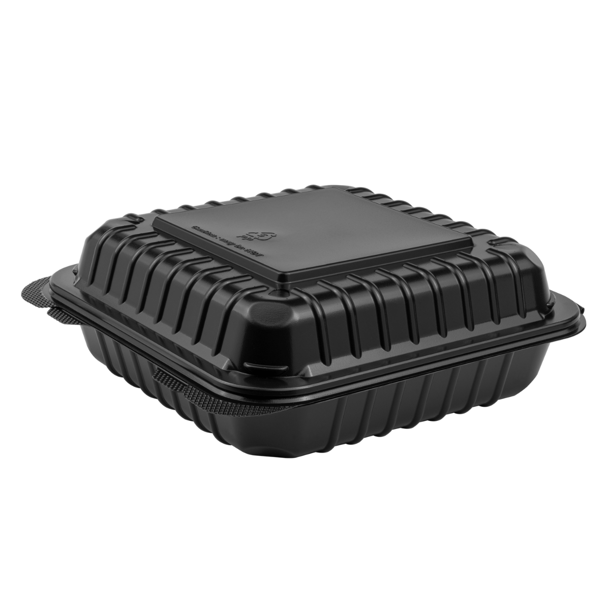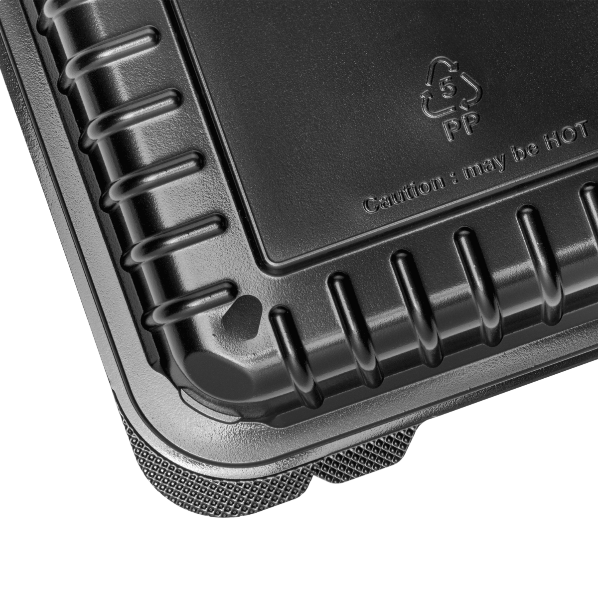 Karat hinged containers are made from high quality polypropylene (PP) material. These containers are sturdy and stackable for easy storage.