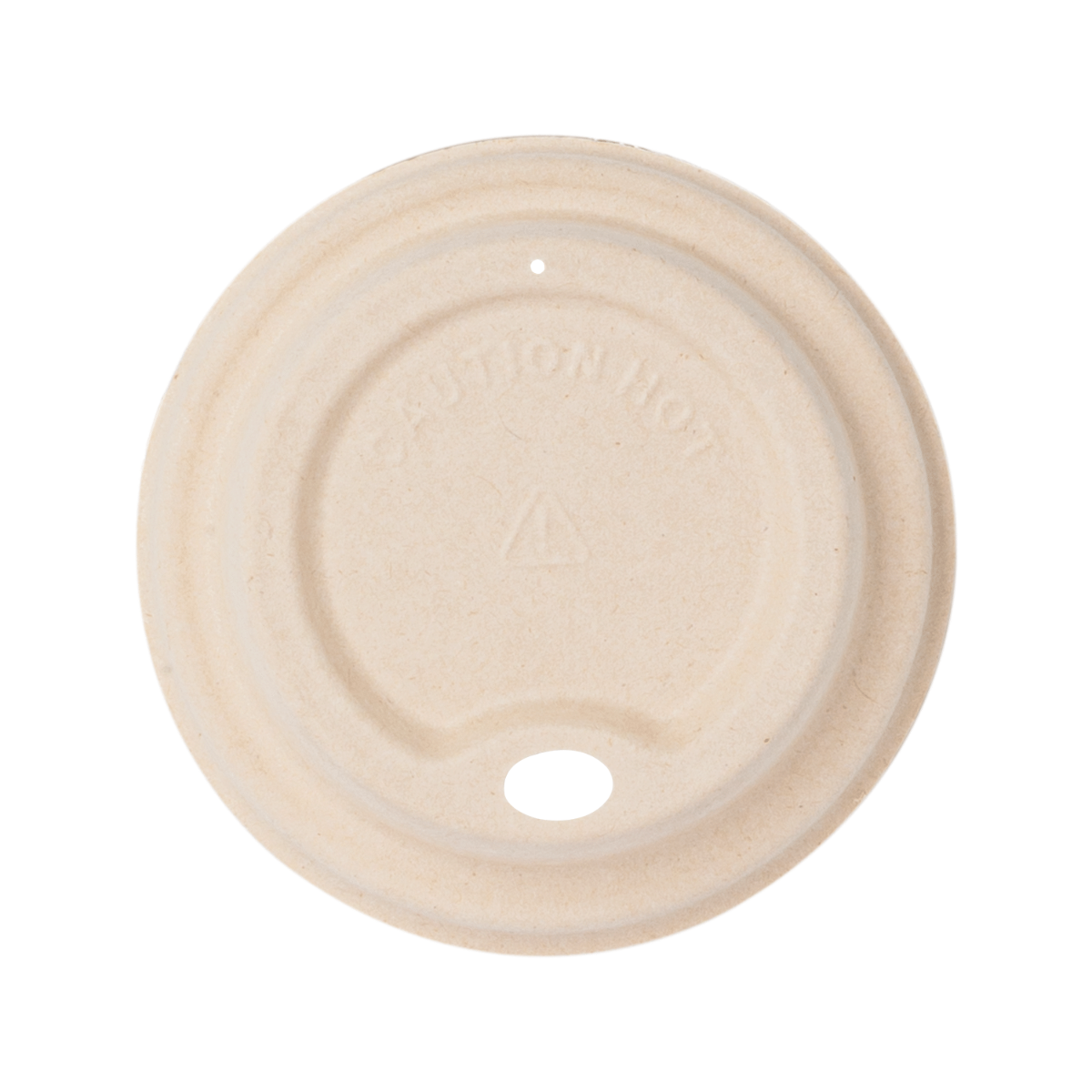 Complete your eco-friendly coffee supplies order with Karat Earth bagasse dome lid for 8 oz hot cups. You have a compostable hot cup, biodegradable sleeve, and now a plastic-free lid to go with it. This coffee cup lid is made from an unbleached plant-based material that gives it a natural earth look. It is designed with a vent hole for smooth drink flow and a caution hot warning label, including a danger symbol, to ensure customers drink with care.
