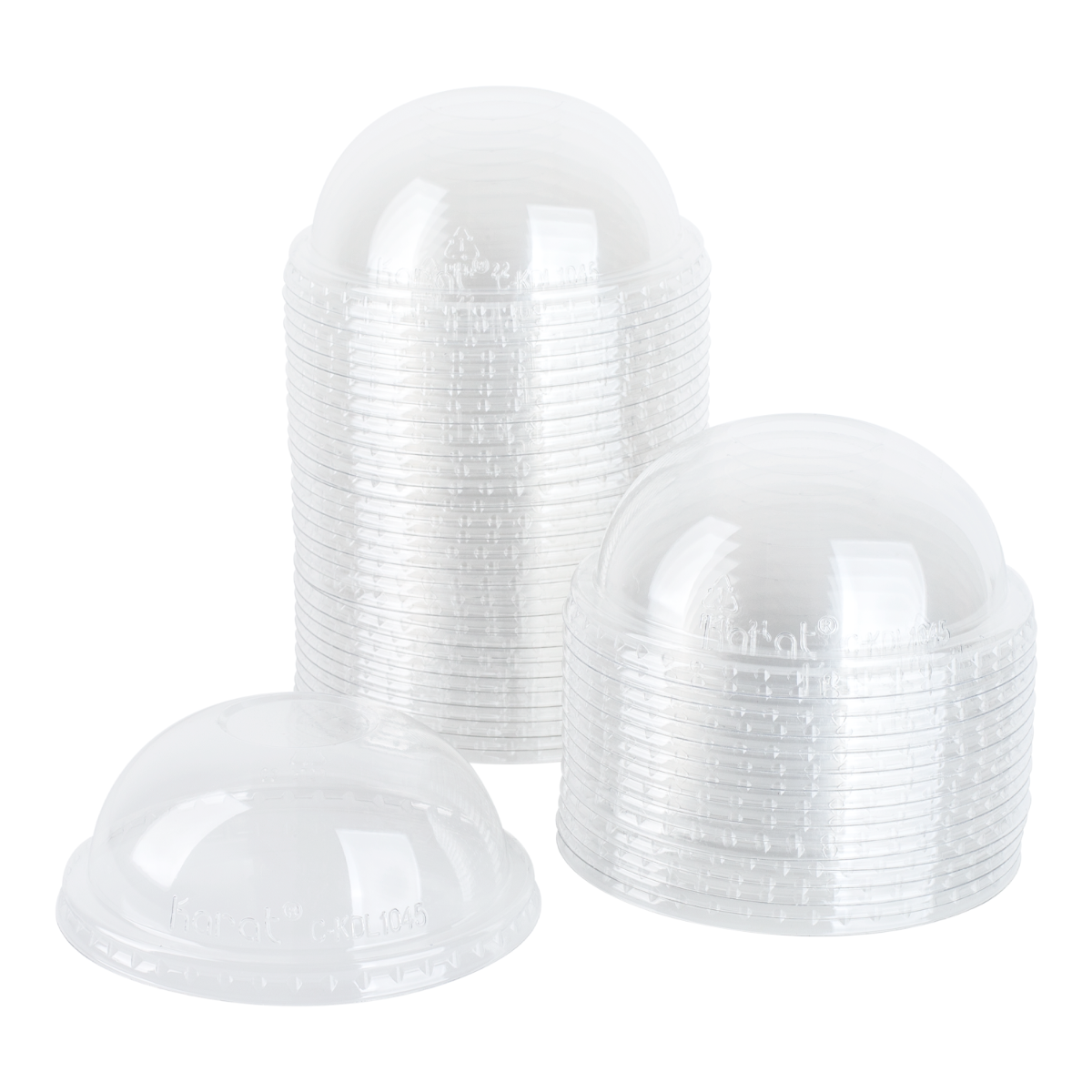 Karat PET No-Hole Dome Lid is for Karat 32 oz. PP cold cup and Karat 32 oz. Paper Cold Cup. From colorful slushie to creamy iced latte, this transparent plastic dome lid is ideal to top off your iced beverages. Great for boba milk tea shops, coffee shops, fast-food restaurants, food trucks, or any to-go establishment.