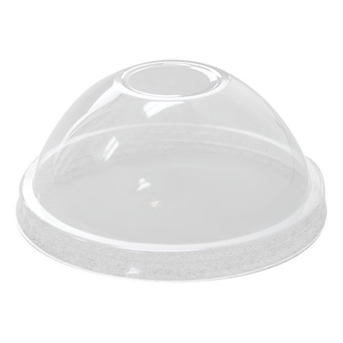 Karat PP Plastic Dome lid with hole fits any 95mm cup rim and allows you to garnish drinks with whip cream, overfill with slushie or top with add-ons. This plastic dome lid is great for ice cream shops, cafes and dessert stands.