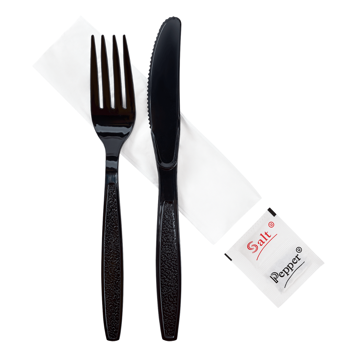 Reduce plastic usage and save money by purchasing cutlery kits with only the essentials you need for your menu. This Karat wrapped utensil kit comes with a plastic fork, plastic knife, 1-ply paper napkin, and salt & pepper packets. The heavyweight PS knife and fork are great for cutting chicken or pork chops while the salt and pepper packets allow customers to season to their taste. Each kit is wrapped to ensure guests receive safe and sanitary utensils every time.